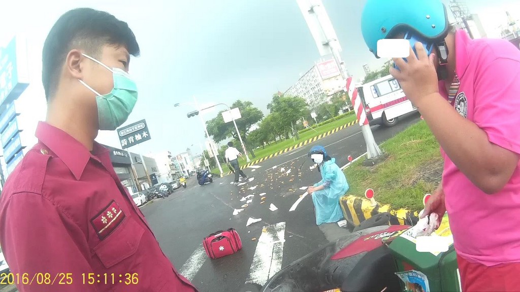 手部和膝蓋都流著鮮血,薛男表情痛苦地坐在路邊,看著地上散落的雞排,心中既無奈又難過。當救護人員要求上救護車時,他卻說「可以讓我打一下(電話)」,「喂?東西都沒辦法送了」。此時同事匆忙趕到,接過薛男的電話解釋情況,他這才安心地踏著蹣跚的腳步登上救護車。