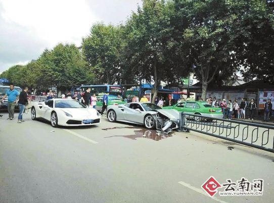 雲南省麗江市古城區長水路27日上午發生一起車禍事故,兩台法拉利跑車為了躲避突然竄出的一隻小狗,一輛撞上隔離島,另一輛車頭右側嚴重受損,而狗狗則是躺在地上死亡,引起許多民眾圍觀,但大家都沒看到狗主人現身,有目擊者就說,「法拉利撞得那麼慘,誰還敢出來說狗是自己的,賠都賠不起」。