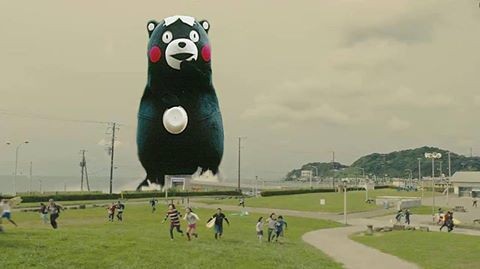 快逃啊!遠方的地平線出現一個龐然大物的身影,草地上的人們嚇得四處逃竄......欸?等等,這黑色的怪物竟然不是哥吉拉,而是深受大家喜愛的「熊本熊」。這張創意照PO上網後,讓粉絲們全笑翻,「熊熊你在酷斯拉什麼啦!」
