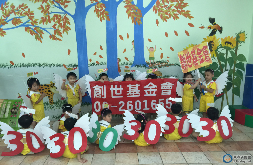 創世30年慶,台南市童園幼兒園裡,30位身穿象徵「創世30」造型翅膀的小天使,頭戴「創世30」造型髮箍,在園長的帶領下,齊聲祝福創世30年「生日快樂!」
