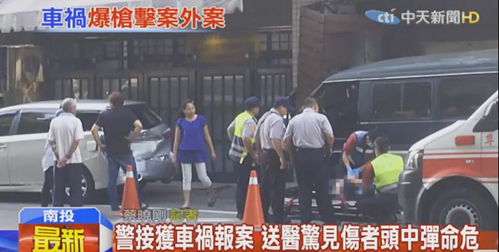 南投縣消防下午4時許獲報,埔里中山路一段有車禍救護事件,立即派人車前往,休旅車還停在路邊,駕駛昏迷受困,車內血跡斑斑,緊急抬出人送往中榮埔里分院。院方救治時卻在駕駛頭部側邊發現有彈孔,才驚覺是中槍,且子彈疑似卡在腦部,急救後轉院至台中榮總,昏迷指數3,生命垂危。