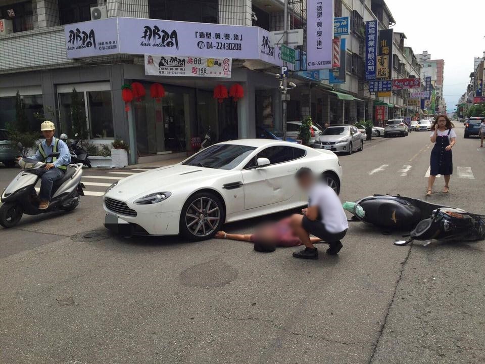 事發於29日上午10時許,監視器畫面顯示,張姓騎士行經北屯旅順路二段、安順東八街口時,因該路口沒有紅綠燈,他疑似沒有禮讓主幹道車輛,直接左轉,奧斯頓馬丁車主看見時緊急剎車,但閃避不及互撞,騎士連人帶車倒地,安全帽當場噴飛,39歲范姓駕駛不顧自己和愛車也受傷,趕緊下車蹲在騎士身邊關心傷勢。