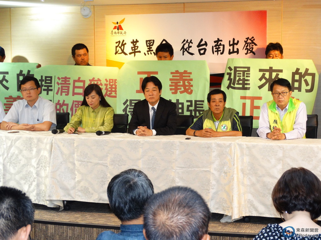 ▲台南市賴清德等人,針對李全教被判議員賞選無效確定案召開記者會。(圖/記者林悅攝)
