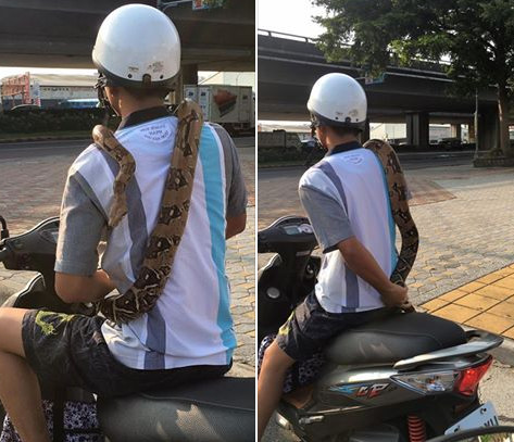 冬天還沒報到,就有民眾急著把鮮豔的圍巾披上身!難道不熱嗎?網友在臉書社團《爆料公社》發文,表示自己騎車經過台中向上路,原本納悶眼前的機車騎士怎麼在夏天圍圍巾,停紅燈時再仔細一看,發現竟是一條蟒蛇,當場嚇得目瞪口呆!照片曝光後立刻引起網友熱議,直呼:「不敢停他旁邊。」