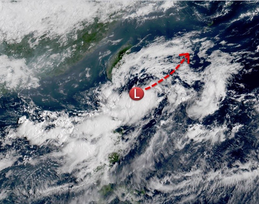 氣象局表示,原本位於巴士海峽東側的低氣壓系統,今天上午8時形成熱帶性低氣壓,目前持續向東北東移動,即朝向琉球南方海面,有逐漸離開台灣附近海域的趨勢;另外,今天台灣中部以北地區水氣較少,大多為多雲到晴,只有南部地區、恆春半島及花蓮、台東雲量較多,且有局部短暫陣雨或雷雨,另外午後在中部山區、東北部山區及接近山區的平地也可能有局部短暫雷陣雨。