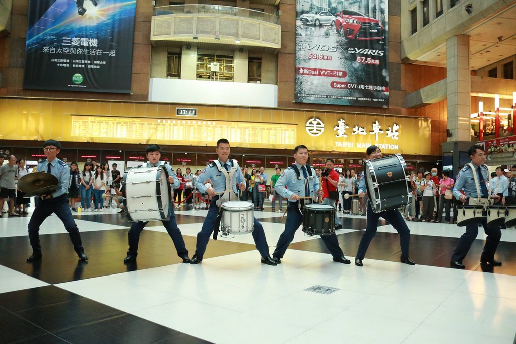 為慶祝九三軍人節,國防部1日展開系列活動,而空軍樂儀隊也在下午5時現身台北火車站1樓大廳「快閃」,除了有空軍儀隊執行駐防交接操槍,另有空軍樂隊打擊秀、打擊較勁,以及空軍人偶大跳「妖怪手錶舞」,並不時與圍觀群眾互動,而民眾也熱情回應、高聲叫好,現場氣氛相當愉悅。