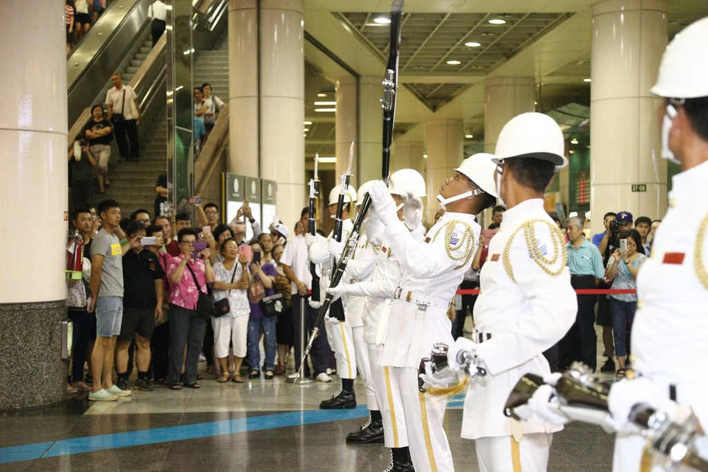 九三軍人節即將到來,國防部推出系列慶祝活動,而海軍儀隊、國防部示範樂隊1日下午5時也現身板橋高鐵站地下街,進行「疾風快閃」活動,演出信號曲、儀隊禮兵交接,以及鋼管重奏團合奏「You Raise Me Up」、行進鼓隊「創勁曲」,吸引在場民眾目光,而海軍司令黃曙光上將也穿著軍服現身會場,以慰勉演出官兵辛勞。