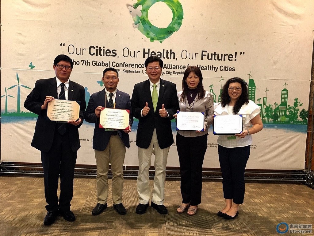 台南市參展第7屆西太平洋健康城市全球會議再傳捷報!31日於韓國原州市會場口頭報告頒獎典禮中,台南市府衛生局口頭海報及口頭簡報都獲獎,分別為「3Q嘸鬱卒長者社區在古都」獲頒最佳口頭海報論文獎、「自殺防治新作為-燒炭自殺防治」獲頒最佳口頭報告獎,台南自殺防治等創新作為,獲得國際肯定,為台灣爭光,在國際舞台成為亮點!