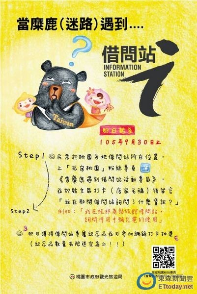「請問,桃園XX路怎麼走?請問,車站怎麼去?…」對初來乍到陌生城市的旅人而言,尋求向他人「借問」是很重要的事。桃園市政府觀光旅遊局,結合在地特色店家,設置7處「借問站」,於9月1日起至9月30,推出『當麋鹿(迷路)碰到借問站』系列活動,帶領大家實境感受,桃園市借問站的熱情與人情味。