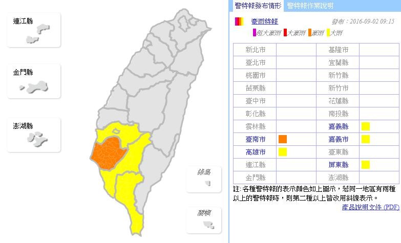 受到低壓帶影響,易有短時強降雨,中央氣象局2日上午發布豪、大雨特報,其中台南市升級豪雨特報,有局部豪雨發生機率。嘉義縣市、屏東縣及高雄市則有局部大雨發生的機率,提醒民眾注意雷擊、強陣風,低窪處慎防積水,用路行車注意交通安全。