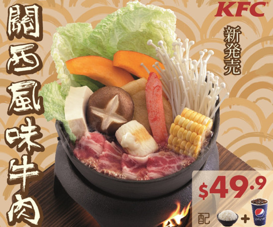 全球速食業者近年瘋狂玩跨界行銷,也在傳統炸雞、漢堡的菜單裡增加變化餐點,香港肯德基就賣起日式火鍋,從9月1日起選在灣仔298電腦特區,限店推出關西風味牛肉鍋,以及和風海鮮湯鍋兩種湯底,少了招牌薄皮嫩雞,改搭配一碗白飯和汽水,每份售價49.9元港幣(約200元台幣),讓消費者能各取所好。