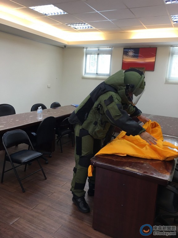 ▲防爆小組在收發室內將疑似爆裂物小心封存。(圖/記者柳名耕翻攝)