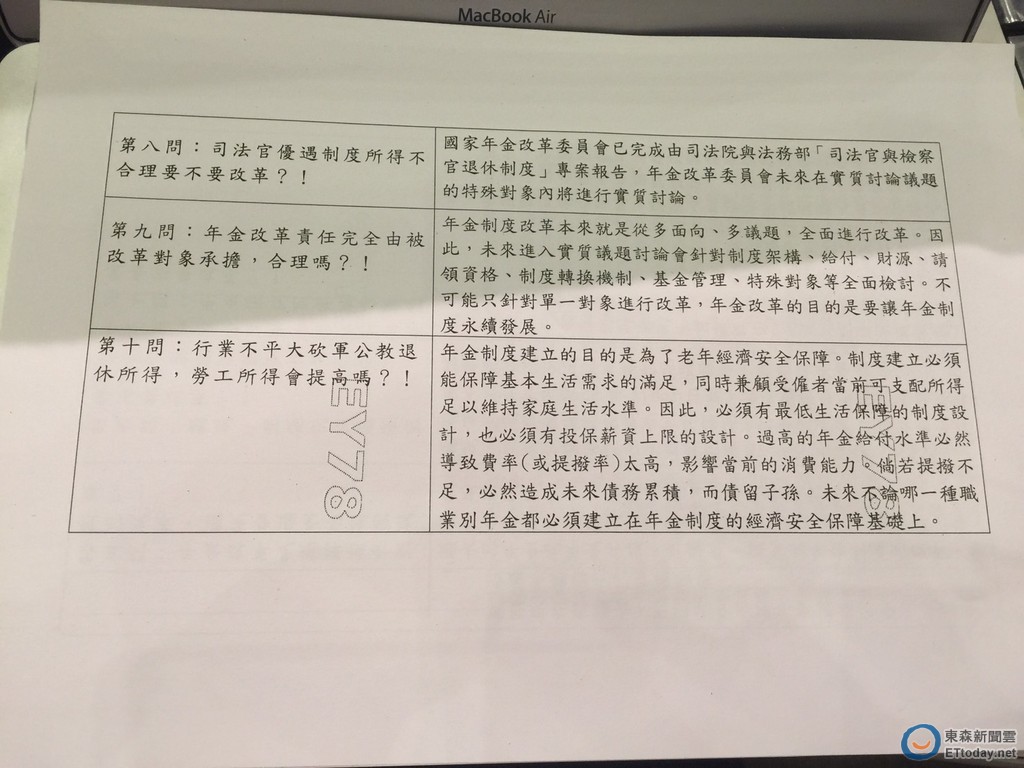 軍公教勞93大遊行,上街頭要求蔡英文新政府在年金改革過程中勿再「污名化」,要求「還尊嚴」,並提出「十問」質疑。對此,行政院發言人童振源與負責年金改革的政委林萬億下午17:00緊急召開直播記者會,並以2張A4的QA格式,逐一解答「十問」。