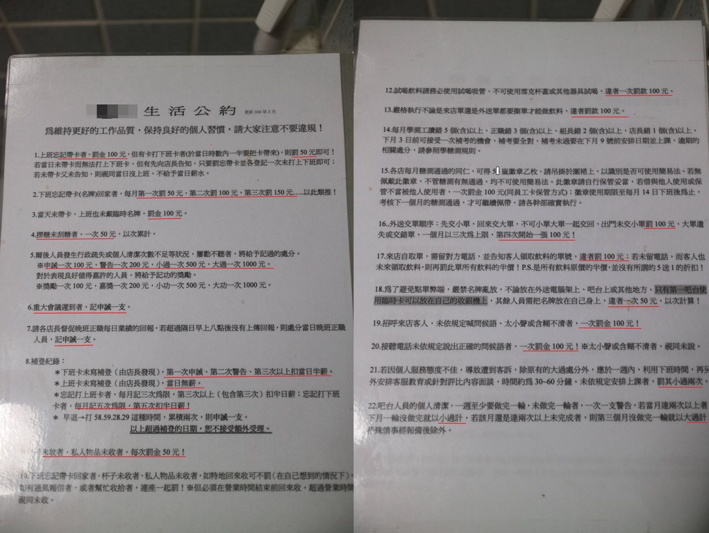 網友在PTT八卦版分享,第一個禮拜每天上3小時學習基本的備料、接待,一周後開始見識到了扣錢制「奇景」,光是生活公約就有31條,洋洋灑灑3頁A4紙。上面寫到「上班忘記帶卡者,罰金100元,若未帶卡又未告知,視同當日沒上班,不給予當日薪水」,「下班忘記打卡者,每月第一次罰50元、第二次罰100元…依此類推」,「撈糖未括糖者,一次罰50元」,「招呼來店客人,未依規定喊問候語,一次罰金100元」,「私人物品未收者,每次罰金50元」,「接聽電話未依規定說出正確問候,一次罰金100元」…等等。