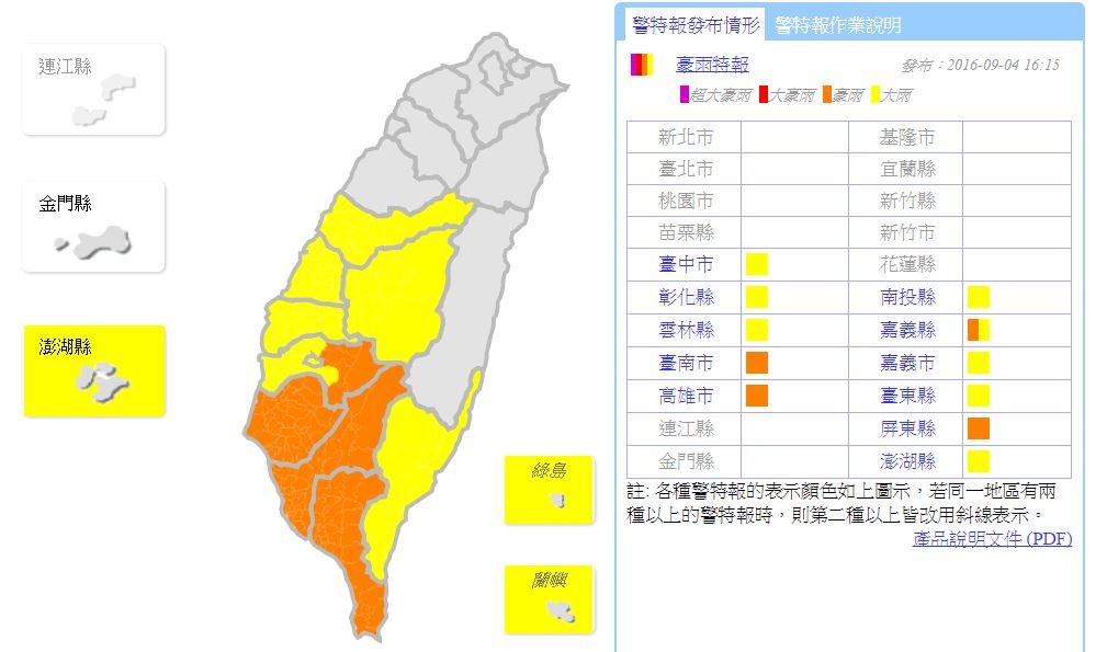 中央氣象局表示,台灣地區今天仍位在低壓帶內,天氣不穩定,稍早已針對多個縣市發布大雨特報、屏東縣發布豪雨特報,不過,16時15分再度將豪雨特報範圍擴大到屏東縣、高雄市、台南市及嘉義縣市,台中以南等8縣市則是大雨特報。