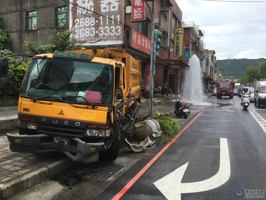 ▲林姓垃圾車駕駛撞斷消防栓再撞倒婦人,消防水柱噴出3層樓高,所幸婦人僅受擦傷。(圖/記者孫曜樟翻攝)