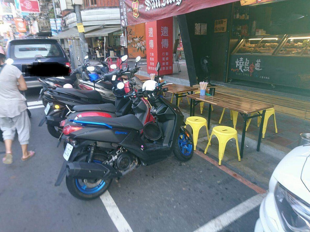 ▼為擺設餐桌椅,業者竟私自亂挪停車格內的機車。(圖/翻攝自爆料公社)