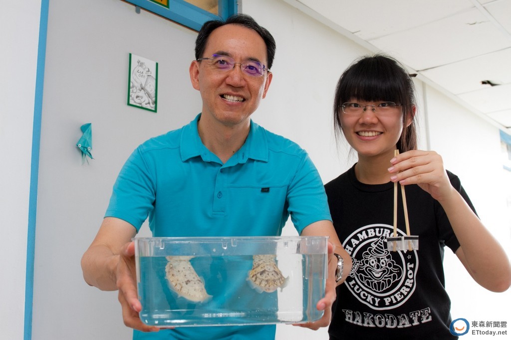 楊璨伊表示,她聽說清大有個做烏賊研究的老師,覺得很有趣,才跟著焦傳金老師做研究,有時候實驗很無聊或失敗時,只要看著牠們游來游去,就很療癒。