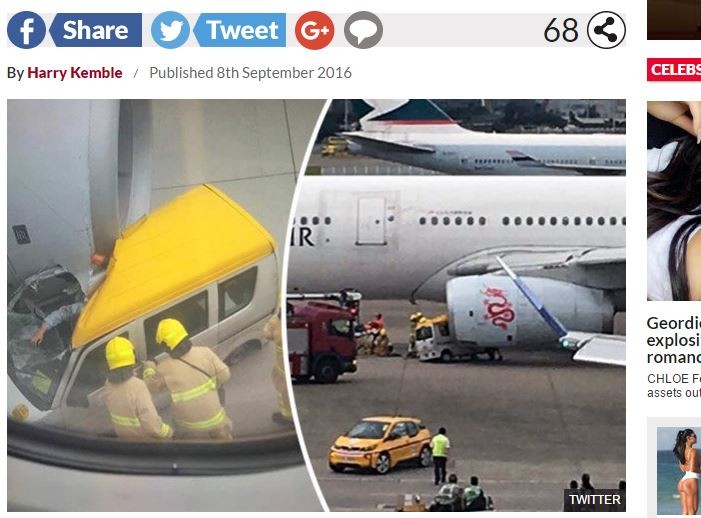 ▲疑遭引擎氣流吸引,小貨車撞港龍航空客機。(圖/翻攝自《每日星報》)