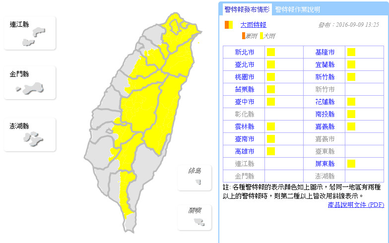 氣象局下午發布大雨特報,警戒縣市包含台北市、新北市、桃園市、基隆市、宜蘭縣、新竹縣、苗栗縣、台中市、南投縣、雲林縣、嘉義縣、台南市、高雄市、屏東縣以及花蓮縣等15縣市,提醒民眾注意局部大雨,並小心雷擊、強陣風,低窪處慎防積水。