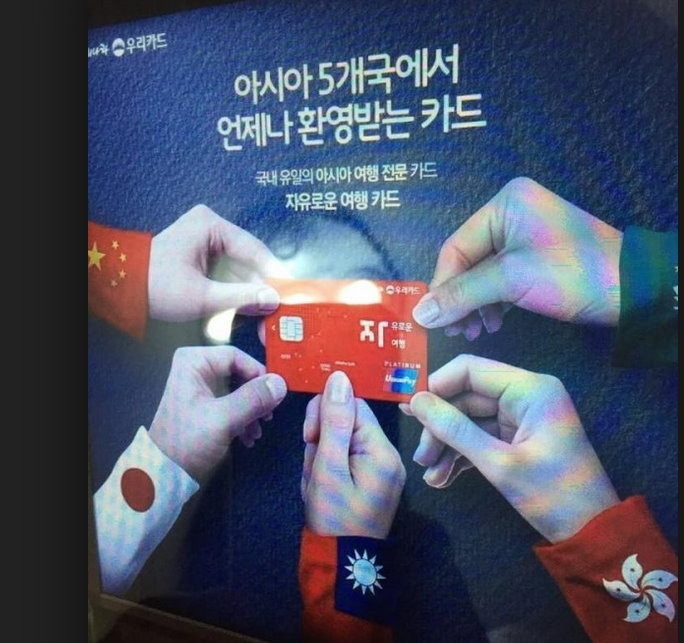 這則出現在首爾地鐵站的廣告中,有五隻手一起拿著一張紅色的友利銀行信用卡,袖管分別為中國和日本的國旗、香港特區、澳門特區的旗,以及中華民國台灣的「青天白日旗」。廣告詞寫著:「這是深受亞洲五國歡迎的信用卡。」