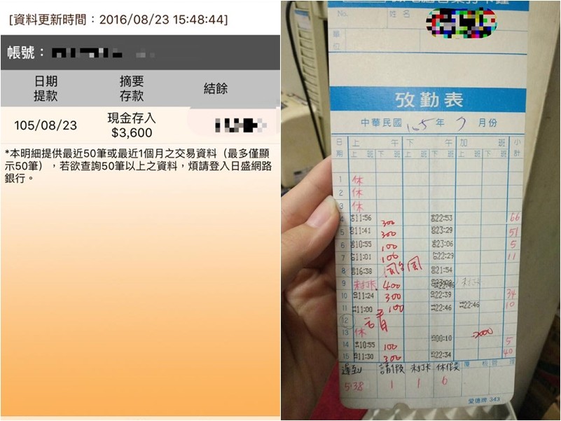 女店員在臉書爆料公社PO文公開帳戶「現金存入3600元」的截圖,爆料自己在電信公司上班,有事先和雇主談好遲到扣錢換晚點上班,沒想到6月提離職,做完7月,打卡上請假3天、休假6天,她聲稱自己月工時已超過230小時,比對勞基法206小時標準上限,8月領薪竟然只領到3.6K,平均時薪僅15.6元。