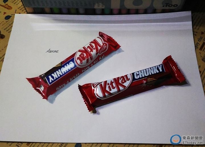 這2包巧克力哪包是真的、哪包是畫的?這些由炎越糖所繪的「3D畫」,不仔細看真的看不出來,原來桌上各式各樣的餅乾零食全都是「平面的」,就算真品就放在旁邊,還是有好多網友大呼「畫太像了,根本無法分辨!」