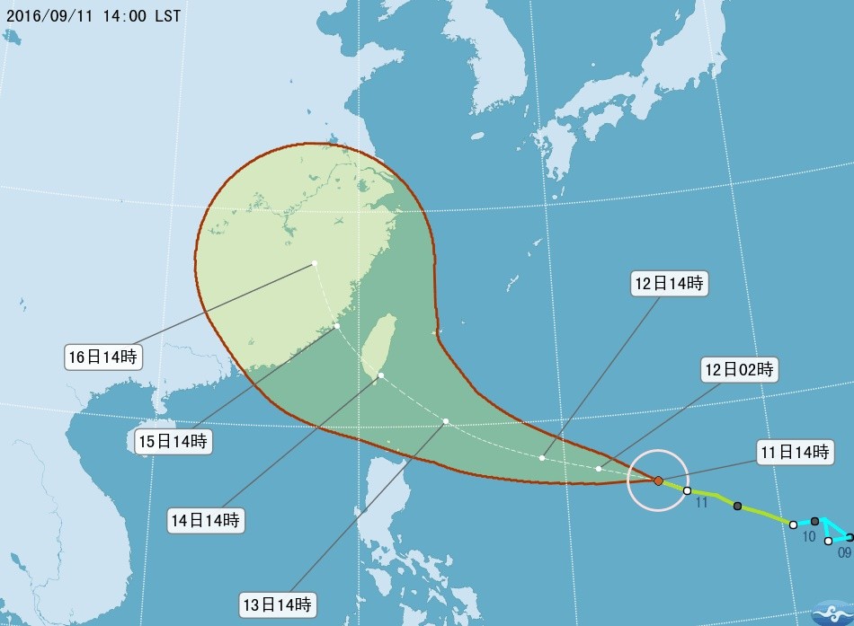 莫蘭蒂增強為中颱了!第14號颱風莫蘭蒂路徑今天上午8時颱風中心位置位於鵝鑾鼻東南東方1700公里海面上,以每小時25公里速度,朝西北西行進,由於強度持續增強,今天下午2時轉為中度颱風。