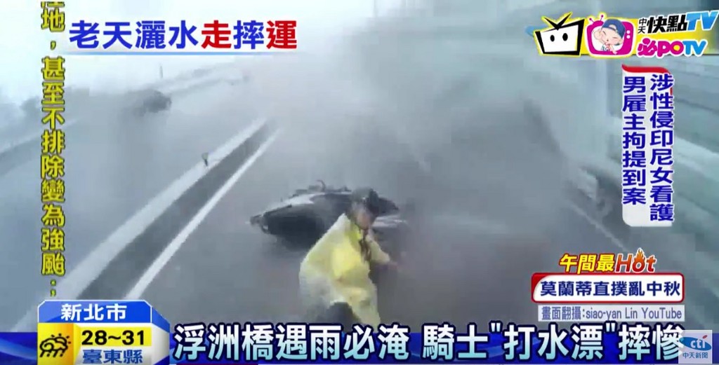▲騎士行經浮洲橋時因積水打滑自摔,險些被後方機車輾斷手。(圖/中天新聞)