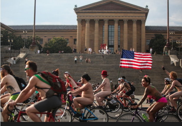 今年活動已邁入第8屆。參加裸騎活動的騎士都在費城藝術博物館附近一個公園出發,車程約19公里,穿過市中心獨立紀念堂及里滕豪斯廣場等熱門地點,吸引大批路人行注目禮。