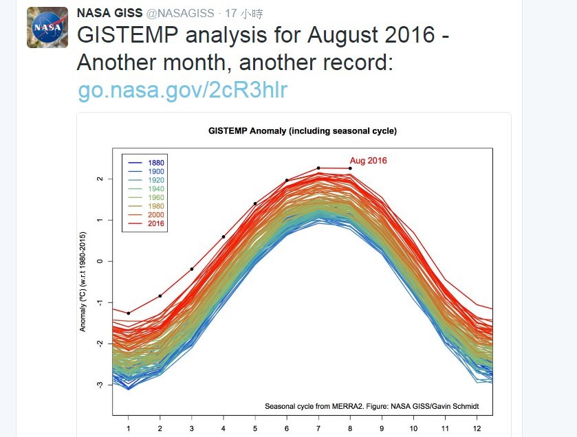 根據NASA的資料,過去有紀錄以來(1880年)最熱的5個月,分別是2016年7月、2011年7月、2015年7月、2009年7月,還有2014年8月。今年7月高溫比起同時期年平均值多了攝氏0.84度、8月則多出了攝氏0.16度,雙雙打破地球有史以來的最熱紀錄。