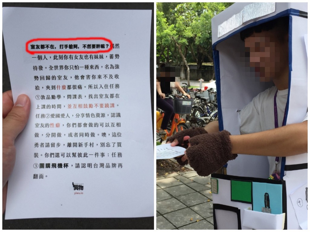 原PO說在宿舍門口區看到一個「可愛投幣機」在發送傳單,還以為是校方的提醒,仔細一看才發現是情趣玩具公司「異物」的開學季打折傳單,上面寫著「室友都不在,打手槍啊,不然要幹嘛?」還教導學生要先了解室友的課表、性癖好,才能不被室友打擾DIY的美好時刻。