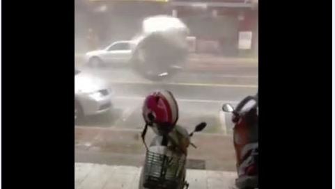 莫蘭蒂來襲,9月14日東南部許多縣市都宣布停班停課,氣象局的高雄測站也在下午1點左右測得13級的超強陣風。一名網友也在「爆料公社」上傳自己拍攝的畫面,從影片可觀察到,風力非常驚人,馬路上不停有物體呼嘯飛過,最後甚至還出現一個超大鐵桶。