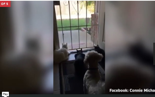 影片中的3隻貓貓都被門外一隻鳥兒所吸引, 一直定定的看著。 接著,一隻白色貴賓狗悄悄繞到3隻貓的後面,想搞清楚牠們是在看啥。