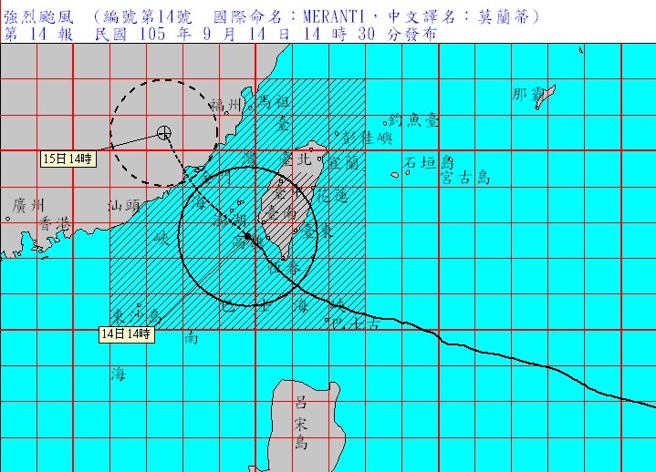 強颱莫蘭蒂來勢洶洶,目前中心在高雄西方近海,向西北移動,目前最大風速已從每秒53公尺減弱到51公尺。中央氣象局表示,由於過去強度略為減弱且暴風圈縮小,下午有機會減弱為中颱,至於第16號颱風馬勒卡沿路經過的海溫較高,預計有增強為中颱的趨勢。