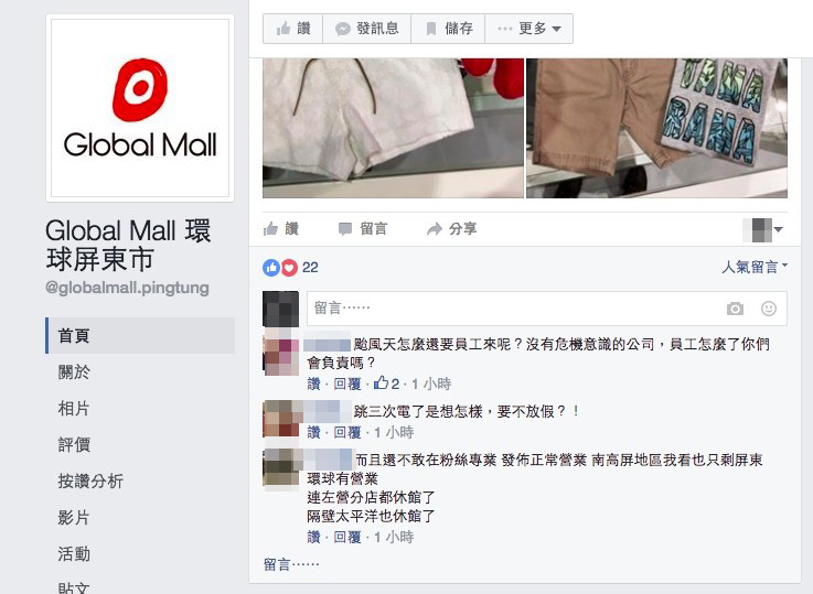 屏東環球購物中心正處暴風圈較強的屏東市內,今在官網與官方粉絲團都未公告營業時間,相當神秘,雖然很低調,但底下留言卻已罵翻,表示「要員工正常上班還怕人知道」。也有員工直接留言,表示你們小孩如果在這裡上班, 還會今天宣布正常上班嗎? 很多同事都是從比較遠的地方騎車來,不要在那裡覺得很像很關心我們,真的很噁心。