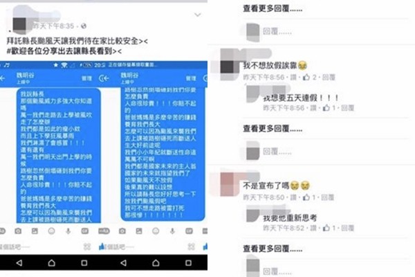 「放個毛」事件惹議後,有網友在爆料公社PO文,指出又有小朋友私訊給魏明谷,目的一樣是為了颱風假,不過這次卻是傳了長長的請願文,「我說縣長,那個颱風威力多強大你知道嗎?我們走路去上學被風吹走怎麼辦?我們都是如此瘦小耶,上下學狂風暴雨我們淋濕也會感冒,萬一上學途中遇到路樹倒榻砸到我們你要怎麼負責?人命很珍貴,你賠不起的!爸媽辛苦賺錢養我們長大,怎麼可以因為不放颱風假斷送我們的大好前途呢?我們小小年紀就斷送性命萬萬不可啊!國家的未來就指望我們了,如果颱風天不放假後果不堪設想,所以請縣長好好思考一下,放我們颱風假吧!我可不想走路被雷打死啊!」