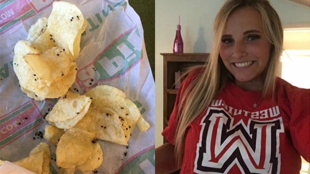 美國奧勒岡州18歲少女艾蜜莉(Emily Wagoner)日前在一間連鎖速食店購買一包鹽醋口味的洋芋片,半包下肚以後,艾蜜莉突然被洋芋片上的「黑胡椒」嚇得乾嘔連連,原來那些黑點竟然是一隻隻的「死螞蟻」。