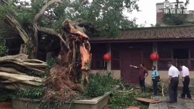 ▲颱風肆虐,金門三級古蹟「總兵署」遭風毀、大榕樹斷。(圖/東森新聞)