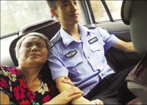 上車後,婦人一直抓著衛劼的胳膊不鬆手。婦人依偎著衛劼肩膀的溫馨畫面,被同事用手機拍了下來,並傳到六安市公安局的官方微博上,獲得網友一片讚賞。