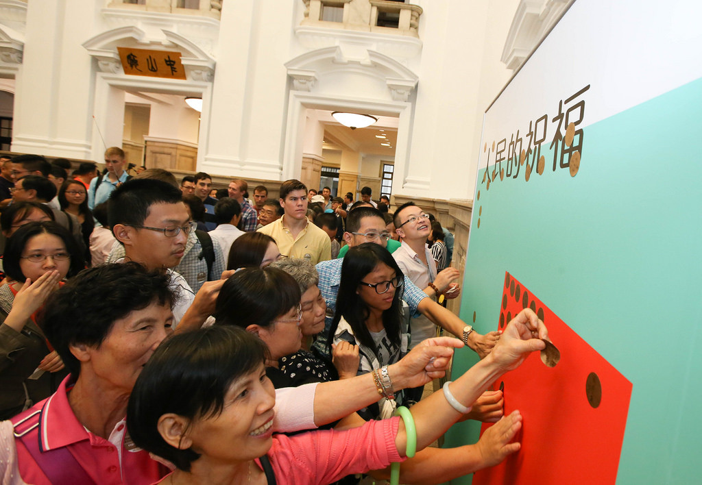 自政黨輪替後,總統府首度對外開放,且由於適逢中秋假期最後一天,民眾紛紛把握時間並在清晨就來排隊等入場。而府方現場還發放小貼紙,欲讓民眾寫下對台灣的祝福,並貼在留言板上,不過,紙條中不少人寫下「九二共識」的字眼,似乎在暗諷總統蔡英文須正面回應,更有陸客團寫下「願祖國統一,兩岸同胞團聚」等敏感話題。