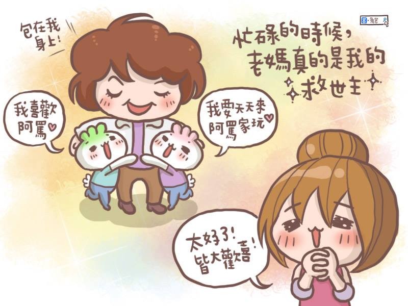 兔包將這次的經驗畫成插畫,只見阿嬤全身發光,菜包、肉包則分別黏在她左右,一臉幸福地喊著「我喜歡阿嬤」、「我要天天來阿嬤家玩」;而兔包則感激地說,「忙碌的時候,老媽真的是我的救世主!」
