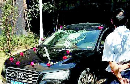 ▲洗髮水從天而降,砸碎禮車擋風玻璃。(圖/翻攝自楚天都市報)