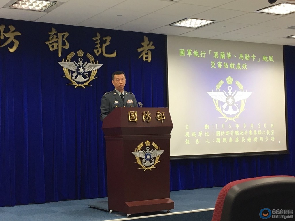 國防部20日上午召開例行記者會,說明「國軍執行『莫蘭蒂、馬勒卡』颱風災害防救成效」。參謀本部聯戰處長鍾樹明少將指出,國軍於12日召開防颱整備會議,並與中央災害應變中心同步完成一級開設;兵力預置部分,國軍完成救災待命兵力計3萬3,000餘人、車輛機具27類3,900餘輛(部)、船艇膠舟129艘,另分別於易發生土石流及淹水等災害潛勢地區計22區102處,完成2,300餘人救災兵力前推預置,協力地方政府執行災害搶救。