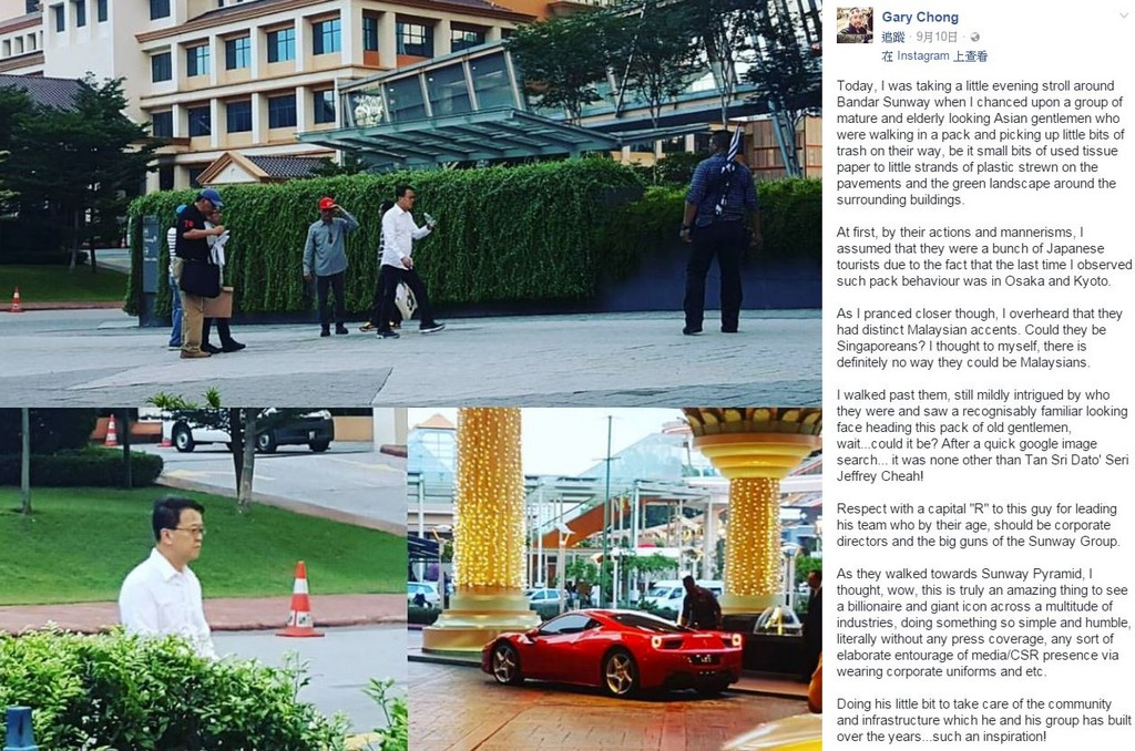 馬來西亞一名網友在散步時,看到一群中年男子正在清理街道上垃圾,上前看覺得面熟,這才驚覺是身價8億6500美元(約台幣270億元)雙威集團的創辦人謝富年(Jeffrey Cheah);事後,將照片上傳到臉書,獲得許多網友回響,大讚行為體現出對於自己的道德,態度值得令人敬佩。