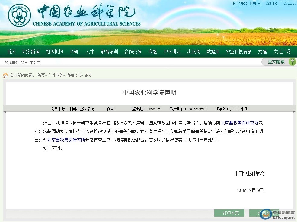 退學博士生魏景亮在《知乎》上爆料,他曾經就讀的中國農業科學院北京畜牧獸醫研究所,下屬的國家轉基因檢測中心不僅偽造檔案,檢測人員的資質和檢測報告也存在嚴重造假現象。事件引起國家農業部重視,今起將派聯合調查組駐進調查。