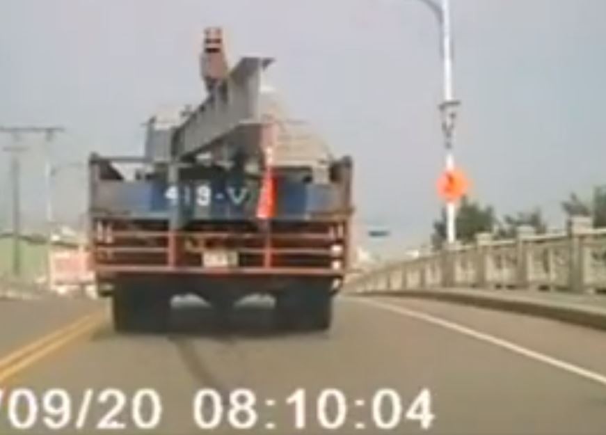 別跟大車跟的太近!一名汽車駕駛於20日上午行經台中市潭子區時,前方的大貨車未將車斗上的貨物固定好,導致其中一根大鐵條因車輛搖晃,竟突然掉落,發出巨大聲響再重重砸向地面。所幸,一旁的機車騎士及時向右閃避,後方駕駛也緊急剎車,並未造成事故,但這危險的一幕也讓網友直呼「如果速度快就變成絕命終結站了」。