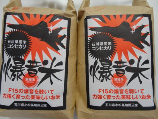 據《全日本新聞網》報導,品種為月光米的「爆音米」包裝以黑紅白呈現,不僅有戰機的剪影,還加上爆炸性的紅色圖樣及斗大的爆音米標題,頗具戰爭時代風格,強調這樣的米是聽著F15戰鬥機的爆音生長茁壯,並兼具美味。