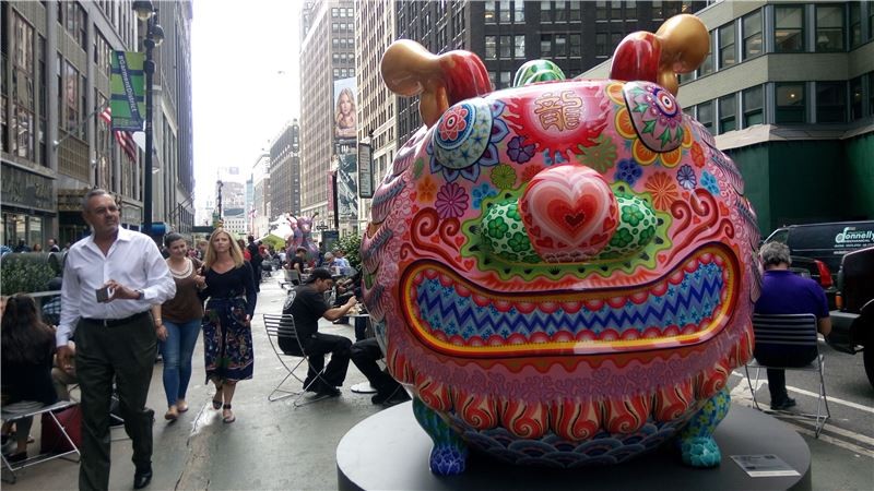 圓龍、熊貓家族、大牛、龍馬、三羊開泰、長景祿、鷹鴿水水牛等11件天馬行空的具像藝術品,9月20日在紐約百老匯街區36至41街街頭出現,彷彿是一場繽紛的動物狂歡遊行。這些動物都是台灣藝術家洪易的創作,在印象畫廊的積極爭取下,成功獲得紐約時尚特區聯盟邀請展出,讓台灣活潑吸睛的作品有機會在博物館外被看見。