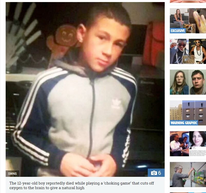 「窒息遊戲(choking game)」是一款極具危險性的遊戲,通常遊戲參與者使用手或工具,將自己弄到幾近窒息,藉此尋求「快感」。英國12歲男童卡內爾(Karnel Haughton)在今年6月時,趁著媽媽傑瑪(Gemma Haughton)外出買東西,自行在家中進行這項遊戲,不慎窒息死亡。傑瑪日前在法庭上表示,事發當天回到家時,看到兒子已經倒臥在階梯旁,一動也不動,送醫之後宣告不治。